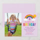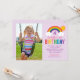Um fundo roxo vibrante prepara o cenário para este convite de foto de aniversário de arco-íris divertido. Listras de arco-íris brilhantes, nuvens fofas e sol alegre enquadram a foto da sua criança ao lado de letras "Aniversário" coloridas e negritadas. Fontes de texto e impressão coordenadas exibem os detalhes da festa em um layout divertido e atraente. Cada linha de texto é totalmente personalizável para se adequar à sua celebração.