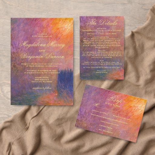 Traga arte atemporal e sofisticação para o seu casamento com este design romântico e sombrio em tons de joia, apresentando uma versão digitalmente aprimorada da pintura de Claude Monet, O Parlamento, Pôr do Sol (1904). A obra-prima original foi artisticamente aprimorada e teve suas cores realçadas para destacar as cores do pôr do sol em tons de laranja dourado, violeta profundo e rosa, criando uma atmosfera luxuosa, elegante e dramática para a sua celebração.