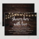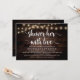 Cartão de Chá de panela de Caligrafia moderna (Chá Her With Love), em luzes de cordas escuras rústicas de madeira design. Convide os convidados com este Cartão de Convite perfeito. Adicione os detalhes do seu chá de panela em texto correspondente.