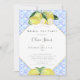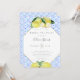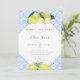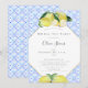 Um convite de chá para festas de chá de noiva, com limões amarelos, desenhados à mão em lápis de cor aquática sobre um padrão de cor aquática de azulejos azuis inspirado nas tradições mediterrânicas. Personalize-o com o nome, a data, a hora e todos os detalhes. Caligrafia moderna pelo nome da noiva e um fundo em forma de diamante.