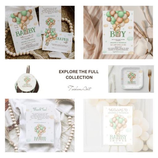 Chegue a um mundo desajeitado e maravilhoso com o nosso Chá de fraldas do Balão de Ar Quente Verde do Teddy Bear! Contra um pano de fundo de céus sonhentos, um ursinho de pelúcia fofinho vagueia num charmoso balão de ar quente, convidando seus entes queridos a celebrar a chegada de seu pequeno pacote de alegria.