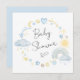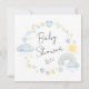 Convite de chá de bébé-bé-bico cônico, apresentando aquarelas azuis e amarelas pastel de um arco-íris, sol, corações, estrelas, luas e nuvens.