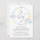 Um convite de chá bébé bimical com aquarelas azuis e amarelas de um arco-íris, sol, corações, estrelas, luas e nuvens, "Oh Baby!" em um roteiro de na moda e o nome e os detalhes do chá da futura mãe em uma simples tipografia moderna.