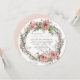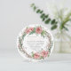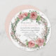 Formato redondo para um chá de fraldas muito único. Tema de chá de menina chamado BOHO com uma paleta de cor doce, muda de cor, cor rosa-pincel, castanho-cacau, cinzas e verde. Apresentando uma coroa de rosa com fôlego de bebê, folhas de eucalipto e salgueiro de rata. No verso, o rosa é pincelado com um design de flor de seta e suas informações de rsvp e registro. Audrey Jeanne Roberts, todos os direitos reservados.