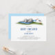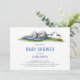 Um convite para o chá de um bebê bonito e moderno com uma ilustração de um elefante bebê e uma cegonha puxando-o com um cobertor azul. A design é complementada com tipografia simples e moderna. Ilustrada e projetada por Patricia Alvarez.