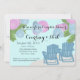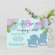 Lanternas de papel cor-de-rosa e azul sobre cadeiras de adirondack, convite para chás de casal para o tema da praia.