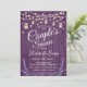 Convite Ao Chá De casal - Madeira Rústica Roxa Lavanda. Design no estilo country com madeira púrpura escura, luzes de cordas de fadas, jarras de pedras e flores de lavanda.