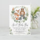 Convite para chás de fraldas de madeira branca com ilustração adorável de aquarelas de cinco amigos da floresta e verde botânico macio