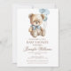 Celebre sua chegada com nosso adorável e elegante convite de chá do bebê 'Teddy Bear'! Apresentando um charmoso ursinho d'água com um doce arco, segurando balões azuis, este design eterno é perfeito para um chá de fraldas clássico, boho ou inspirado no livro de histórias. Uma maneira deliciosa de dar o tom para uma celebração memorável e na moda!