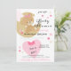 Chá de menina bonita com um desenho adorável de ursinho de pelúcia sentado na lua com um coração cor-de-rosa e um arco e estrelas na cor escura e rosa claro e creme. Grelha e chá de fraldas adorável. Fácil de personalizar substituindo o texto pelo seu.