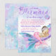 Convite de chá de bebê à distância de menina por correio com adorável bebê sereia morena com cauda rosa em uma bela cauda de sereia rosa, roxa e azul turquesa e fundo submarino. Este convite de chá de bebê de sereia é facilmente personalizado com seus detalhes.