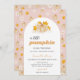 Celebre sua pequena abóbora com este Convite de Chá de Bebê Abóbora Boho Menina. Apresenta um charmoso design de arco branco com abóboras laranja em aquarela caprichosas e flores boho suaves, tudo contra um fundo rosa suave. Perfeito para um chá de bebê rústico de outono com um toque doce e feminino. BBS917