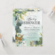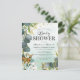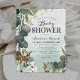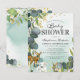Convites de chá de bebê floresta verde com lavagem de aquarela verde azulada empoeirada, folhas de eucalipto botânicas, respingos de folha de ouro falso, animais bebês da floresta e um modelo de festa de chá de bebê moderno e fácil de personalizar.