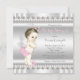 Convite de chá de bebê rosa e cinza adorável com bebê anja em um fundo cinza rosa e prata e cordões de pérolas. Este convite de chá de bebê rosa e cinza fofo e elegante é facilmente personalizado para o seu evento, adicionando seus detalhes no estilo de letra, cor e redação de sua escolha. Design impresso sem laços de brilho de pérolas reais, etc.