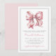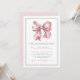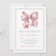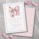 Um tema de chá de bebê com laço rosa fofo e feminino, apresentando um adorável bebê ou um laço de aquarela rosa. A frente inclui linhas de caligrafia manuscrita em uma cor rosa suave para combinar com o laço, combinadas com uma moldura cinza fina dupla para um toque elegante e tradicional. A parte de trás apresenta uma cor rosa que complementa o laço na frente.