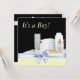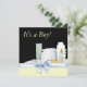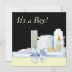 Convite para chá de bebê amarelo, preto e azul adorável com artigos de infantaria embrulhados com arco azul doce, blocos para bebês, fraldas, pato de borracha amarelo, garrafa de bebê e pó. Adicione os seus detalhes à frente e/ou atrás adicionando os detalhes do evento, estilo da fonte, tamanho da fonte e cor e texto.