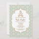 O elegante e belo francês marroquino inspirou convites para bebês com um azul de casca de ovo repetido, um aqua pálido, um verde-claro e um padrão geométrico de ouro design e florescimentos florais de ouro abarrotados. Este convite de aparência altíssima e luxuosa é perfeito para qualquer chá de fraldas formal, exótico, marroquino, árabe ou aladino. A parte traseira desses convites personalizados de quadro de rico pode ser personalizada com o nome da mamãe a ser e o nome do evento na forma quatrefoil e na design de aparência de fita impressa. Trabalho de arte e design © Chrissy H. Estúdios, LLC. Todos os direitos reservados.