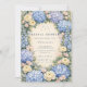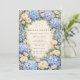 Um design de chá de panela inspirado em um jardim romântico, apresentando hidrângeas azuladas exuberantes combinadas com rosas marfim suaves e delicadas flores de campo. As flores enquadram a composição em uma elegante disposição simétrica com detalhes clássicos sutis, criando uma estética refinada e atemporal. O fundo bege quente realça a suavidade da paleta azul, mantendo um visual gracioso e sofisticado. Perfeito para uma celebração sofisticada com uma elegância fresca de jardim.