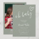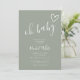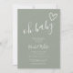 Um convite de chá de bebê moderno minimalista com um coração desenhado à mão e tipografia estilosa em um fundo verde sage e sua foto especial no verso. Criado por Thisisnotme©