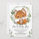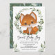 Adorável convite ao chá de fraldas, com aquarela ilustrativa de uma raposa doce para bebês e uma coroa de vegetação botânica moderna. Os campos de texto são totalmente editáveis (exceto as palavras "Sweet Baby Boy").