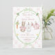 Uma entrega encantadora do jardim do Sr. McGregor! O convite apresenta uma moldura personalizada pintada à mão com um padrão de fita rosa crocante acentuado com uma grinalda de fita verde clara exuberante, criando um visual limpo, clássico e acolhedor. Uma doce linha de varal de aquarela está estendida no centro, exibindo orgulhosamente itens minúsculos e adoráveis, cada um apresentando sutilmente um coelhinho vestido de rosa em estilo Peter Rabbit. A cena é completada com cenouras frescas fofas e narcisos brilhantes e alegres, todos renderizados em um estilo de aquarela suave. É fácil adicionar seus próprios detalhes e alterar o estilo da fonte, tamanho, cor e posicionamento se desejar. Este convite é um lindo souvenir, convidando seus convidados a compartilhar a expectativa "saltitante" da chegada da