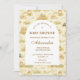 Um design de safari em estilo de livro de histórias delicado, apresentando adoráveis animais bebês em aquarela, incluindo leões, girafas e elefantes, cercados por uma vegetação suave da selva e um fundo botânico delicado. A paleta neutra e quente de creme, dourado mel e oliva suave cria uma estética atemporal inspirada na natureza, enquanto o layout arqueado elegante fornece um belo espaço para detalhes do evento.