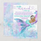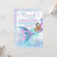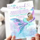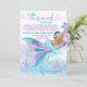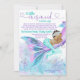 Convites de chá de bebê por encomenda com adorável bebe sereia morena com cauda azul-esverdeada dormindo em uma bela cauda de sereia rosa, roxa e azul-esverdeada e fundo marinho. Este convite de chá de bebê de sereia é facilmente personalizado com seus detalhes.