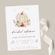 Um convite de chá de noiva de outono/adouto Caia de Amor bonito com uma abóbora de aquarela branca adornada com um arranjo de flores de aquarela e folhas em laranja terracota, ameixa, pêssego e marfim. "Chá de noiva" está em fonte de caligrafia de ameixa. Personalize com seus detalhes. O verso é em ameixa sólida.