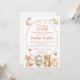 O convite do chá de bebê de animais da floresta apresenta um belo design em aquarela com uma raposa, uma ovelha, um urso e um pequeno patinho. Eles estão reunidos em um jardim de flores silvestres e duas pequenas abelhas estão coletando néctar. A lua e algumas estrelas estão no céu. Personalize o convite com todas as suas informações usando o modelo fácil de usar fornecido.