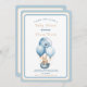 Este belo convite é perfeito para o chá do seu bebê. Ele apresenta um belo coelho, aninhado em um balão de ar quente feito de belos balões azuis enfeitados com flores e estrelas. A mistura suave de brancos e azuis cria uma atmosfera serena e acolhedora para o seu evento. A elegante tipografia e a ilustração encantadora combinam-se para fazer deste convite uma escolha perfeita para celebrar a chegada iminente do seu pequeno.