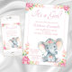 Convites de chá de bebê de elefante menina com adorável elefante em aquarela com lindas flores cor-de-rosa na cabeça em um lindo fundo floral cor-de-rosa. Estes convites de chá de bebê de elefante fofo são facilmente personalizados para o seu evento, basta adicionar seus detalhes.