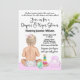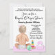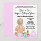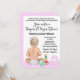 Convite de chá de bebê de fraldas e lenços com adorável bebê menina com brinquedos em um fundo de bolinhas cor-de-rosa fofo.