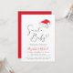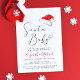 Um convite de chá de bebê para casais minimalista e fofo para a temporada de Natal, apresentando "Santa Baby" escrito em uma fonte elegante com um floreio em forma de coração, uma ilustração em aquarela de um chapéu vermelho de Papai Noel e um convite para um chá de bebê alegre. Personalize os nomes da mãe e do pai em uma fonte vermelha estilosa e adicione os detalhes do chá em uma tipografia moderna simples.