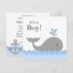 Convite de chá de bebê de baleia azul e cinza adorável apresenta uma onda azul e uma baleia cinza fofa na frente e atrás com uma âncora atrás. Adicione seus detalhes na frente e/ou atrás adicionando os detalhes do seu evento, estilo de fonte, tamanho e cor da fonte e texto.