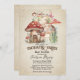 Este convite personalizado apresenta um tema de chá de bebê de jardim encantado. O fundo é um design de papel pergaminho desbotado para se assemelhar a um livro de contos de fadas vintage. Uma imagem de uma pequena casa de cogumelo e caminho que leva a um jardim de fadas encantado é mostrada na parte superior. Várias flores e cogumelos são colocados ao longo do caminho. Luzes delicadas de fadas acentuam as partes superior e inferior.