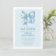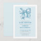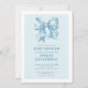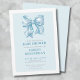 Um tema de chá de bebê clássico e fofo com laço azul, apresentando um adorável laço em aquarela azul bebê misturado com um fundo azul claro. Uma mistura de fontes cinza e azul com uma tipografia serifada em negrito e uma fonte moderna simples. Celebre a futura mamãe com estilo! Disponível também em mais esquemas de cores. Você pode alterar as cores das fontes para o que desejar. Você também pode alterar a cor do fundo na frente e no verso. Convite de Chá de Bebê Laço Azul.