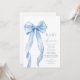 Este convite de chá de bebê apresenta um laço azul elegante e tipografia estilosa. Criado por Thisisnotme©