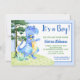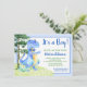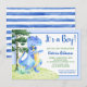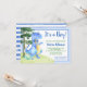 Convites de chá de bebê de dinossauro menino com adorável dinossauro de aquarela vestindo uma gravata borboleta fofa em uma faixa azul de aquarela e fundo ao ar livre. Este convite de chá de bebê de dinossauro é facilmente personalizado para o seu evento, basta adicionar seus detalhes.