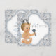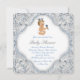 Convite de chá de bebê do príncipe com adorável príncipe bebê em um lindo fundo azul e prata com redemoinho. Este convite de chá de bebê do príncipe azul e prata é facilmente personalizado para o seu evento adicionando detalhes do evento, estilo de fonte, tamanho e cor da fonte e texto. Você também pode adicionar uma cor de fundo.