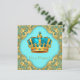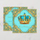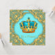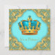 Chá de bebê do príncipe azul e dourado com coroa azul turquesa e dourada em um belo fundo azul turquesa e dourado. Este convite de chá de bebê do príncipe azul e dourado é facilmente personalizado para o seu evento, basta adicionar seus detalhes no estilo de fonte e cor, texto e layout de sua escolha.