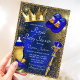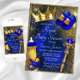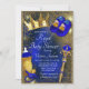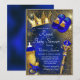 Convite de chá de bebê do príncipe azul realeza com adoráveis elementos dourados e azul realezas em um lindo fundo azul e dourado. Este convite de chá de bebê do príncipe real é facilmente personalizado com os detalhes do seu evento.