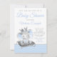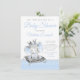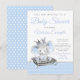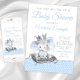 Convites de chá de bebê de elefante com adorável elefante bebê menino usando uma coroa azul bebê e prata sentado em uma almofada elegante com borlas prateadas em um fundo azul bebê e branco com bolinhas. Estes convites de chá de bebê de elefante são facilmente personalizados para o seu evento, basta adicionar seus detalhes. Você pode remover a coroa e também pode remover o fundo da parte traseira se preferir.