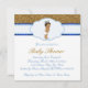 Convite de chá de bebê de príncipe étnico adorável em azul e dourado. Este convite de chá de bebê de príncipe étnico é facilmente personalizado para o seu evento, adicionando os detalhes do evento, estilo de fonte, tamanho e cor da fonte e texto. Algumas artes gráficas©Delightful-Doodles.