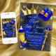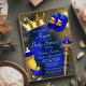 Convite de chá de bebê do príncipe real com bela coroa azul real e dourada e coisas de bebê em um belo fundo azul real e dourado. Você pode alterar o texto conforme necessário para o seu evento. Imprima em papel brilhante para obter os melhores resultados.