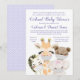 Convites de chá de bebê drive by para menina com adoráveis animais bebês usando máscaras em um fundo roxo lavanda com bolinhas. Este convite de chá de bebê drive by ou por correio é facilmente personalizado com os detalhes do seu evento. Você pode alterar o texto, o estilo da fonte e as cores da fonte.