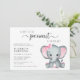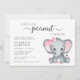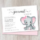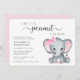 Um chá de uma menina bonita apresentando "A Sweet Little Peanut Is On Her Way" em tipografia de cinza mole e um roteiro de troca de na moda e uma coloração d'água rosa pastel de um elefante bebê. Adicione o nome da mãe e os detalhes do chá em uma simples tipografia de cinzas moderna.