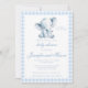 Adorável convite de chá para bebê apresentando uma ilustração azul encantadora de aquarela de um lindo elefante bebê vestindo gravata azul de arco em um padrão de gingham. Ideal para chás de bebês, celebrações temáticas de 'amendoim pequeno'.