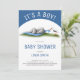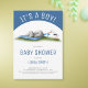 Um convite de chá para um bebê bonito e único, com uma ilustração de um elefante para bebês e uma cegonha tentando fazer a entrega. Fontes modernas e um belo fundo azul, complementam este design. Ilustrada e projetada por Patricia Alvarez.