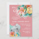 Pastel rosa, lacrimejo, floral amarelo com um adorável convite de chá de fraldas para uma bebê elefante