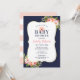 Este convite de chá de bebê elegante apresenta um texto serifado ousado "Baby Shower" dentro de uma moldura de colchetes dourados sobre um rico fundo azul-marinho, acentuado por arranjos de canto em aquarela exuberantes com flores de dália e rosa cor-de-rosa, pêssego e coral, com folhagem verde fresca. A caligrafia rosa destaca o nome da homenageada para um toque feminino e refinado. Um padrão de listras largas em azul-marinho e branco adorna a parte de trás do cartão. Todo o texto é totalmente personalizável para a sua celebração.